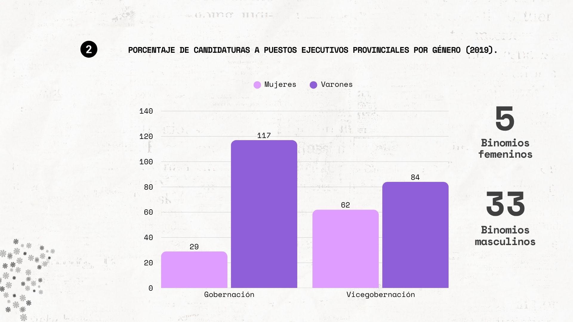 El objetivo de ésta monografía será analizar la disparidad de género en la postulación y elección para los cargos de gobernadora y vicegobernadora en las elecciones de 2019 y 2023 en las provincias de Argentina, con el fin de identificar
