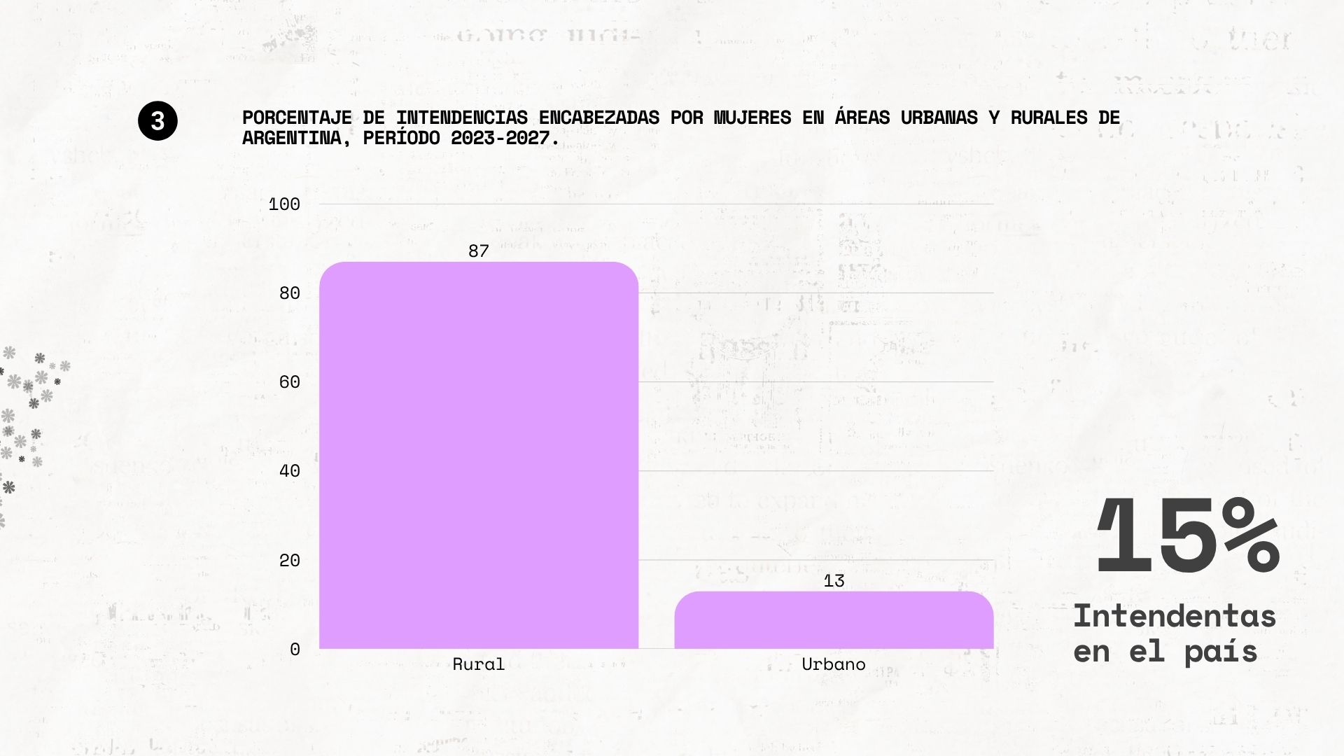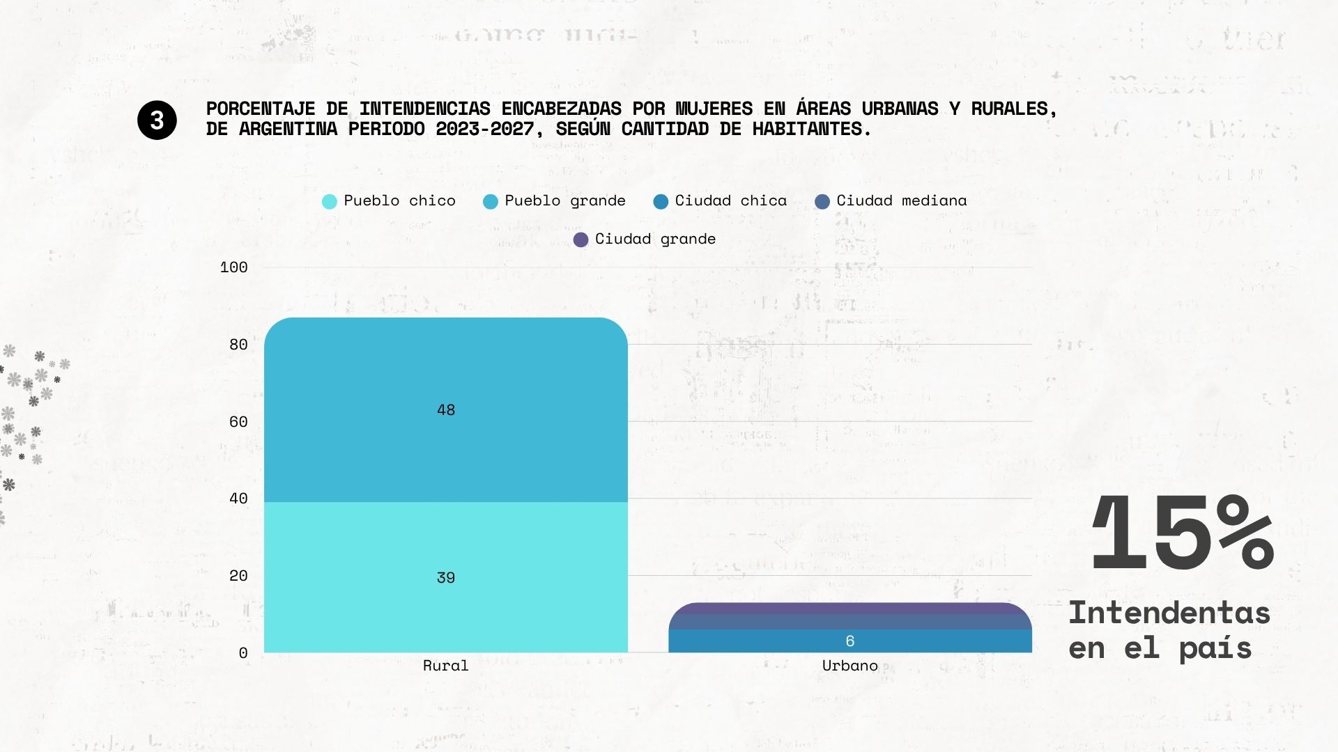 Resulta pertinente abordar este tema, debido a la desigual proporción que se vislumbra en los encabezamientos de las intendencias a nivel nacional, entre ambos géneros. Dicho de otra manera, solo el 15% de las intendencias están representadas por mujeres, mientras que el 85% restante las encabezan hombres. Asimismo, esta desigualdad ha sido el puntapié que nos impulsó a investigar la distribución de las intendentas en todo el territorio argentino, y examinar detenidamente su representación en las áreas rurales y urbanas del país.