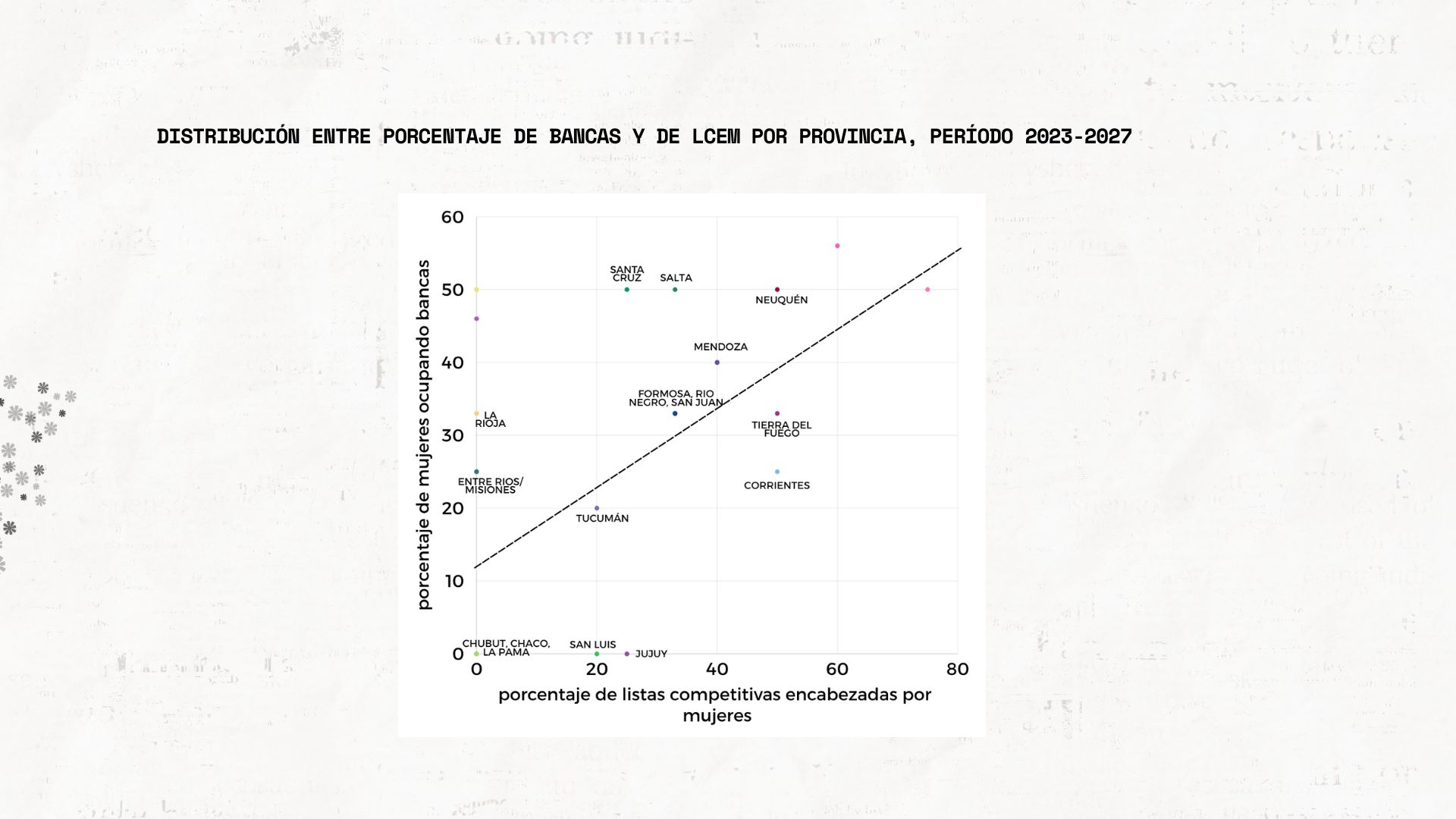 Este trabajo analiza las legislaturas provinciales y su grado de adecuación efectiva a los principios de paridad. Aunque las listas deben armarse con alternancia de género, los resultados no necesariamente reflejan ese equilibrio. Ocho provincias aún no superan el 45% de participación femenina en sus cámaras.